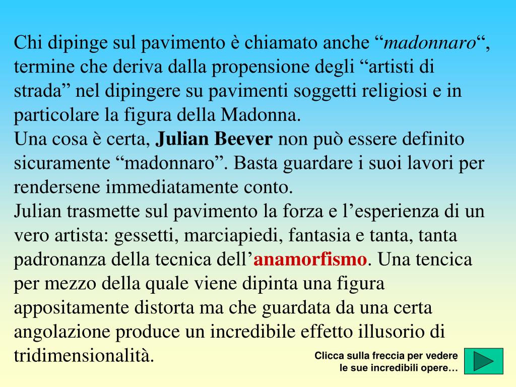Chi dipinge sul pavimento è chiamato anche “madonnaro“, termine che deriva dalla propensione degli “artisti di strada” nel dipingere su pavimenti soggetti religiosi e in particolare la figura della Madonna.Una cosa è certa, Julian Beever non può essere definito sicuramente “madonnaro”. Basta guardare i suoi lavori per rendersene immediatamente conto.Julian trasmette sul pavimento la forza e l’esperienza di un vero artista: gessetti, marciapiedi, fantasia e tanta, tanta padronanza della tecnica dell’anamorfismo. Una tencica per mezzo della quale viene dipinta una figura appositamente distorta ma che guardata da una certa angolazione produce un incredibile effetto illusorio di tridimensionalità. Clicca sulla freccia per vedere le sue incredibili opere…