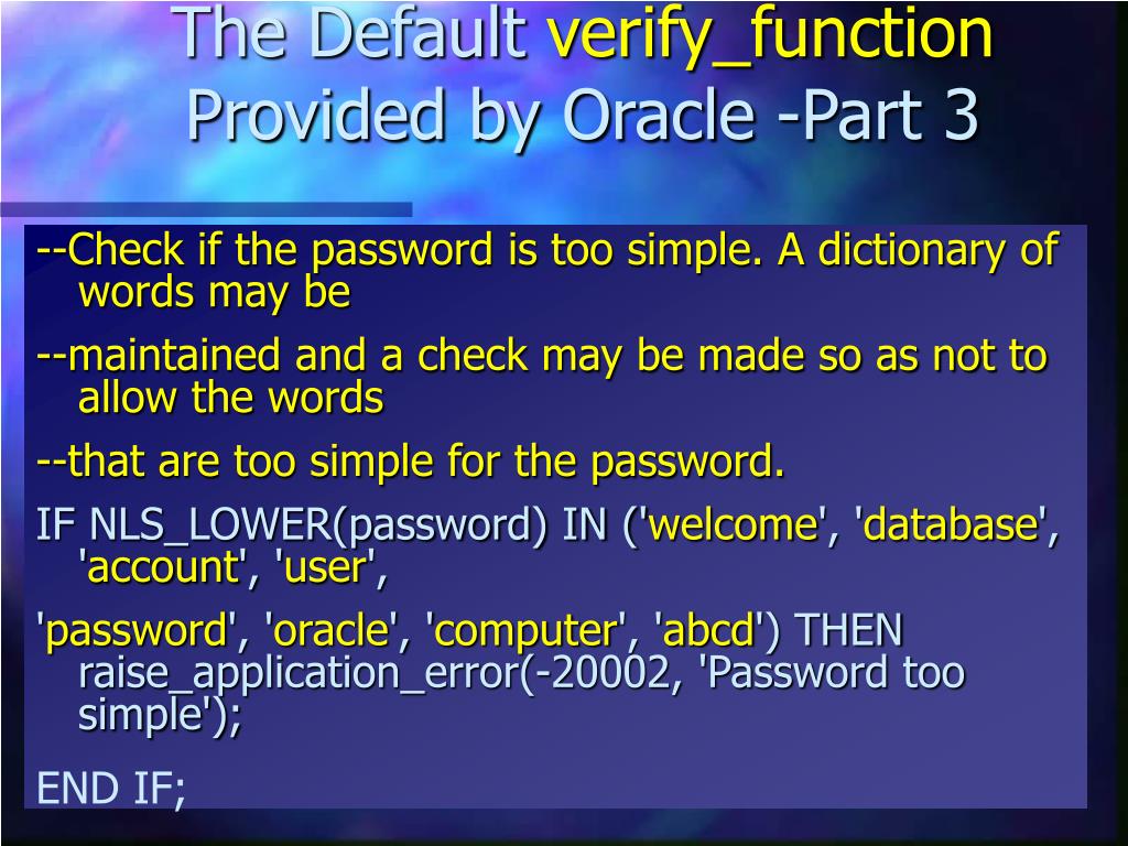 The Default verify_function Provided by Oracle -Part 3 --Check if the password is too simple. A dictionary of words may be --maintained and a check may be made so as not to allow the words --that are too simple for the password. IF NLS_LOWER(password) IN ('welcome', 'database', 'account', 'user', 'password', 'oracle', 'computer', 'abcd') THEN raise_application_error(-20002, 'Password too simple'); END IF;