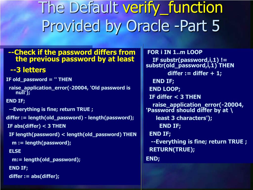 The Default verify_function Provided by Oracle This function must be created in SYS schema, and you must connect sys/<password> as sysdba before running the script. This snippet contains the start of the function and checks if the password is the same as the username. The verify_function is shown in five parts:1. The beginning of the verify_function, check if the password is the same as the username2. Check to make sure that the password has at least 4 characters3. Check to make sure that the password is not “too simple” by comparing against 8 simple words4. Check to make sure that the password contains at least one letter, one digit, and one punctuation mark5. Check if the password differs from the previous password by at least 3 letters