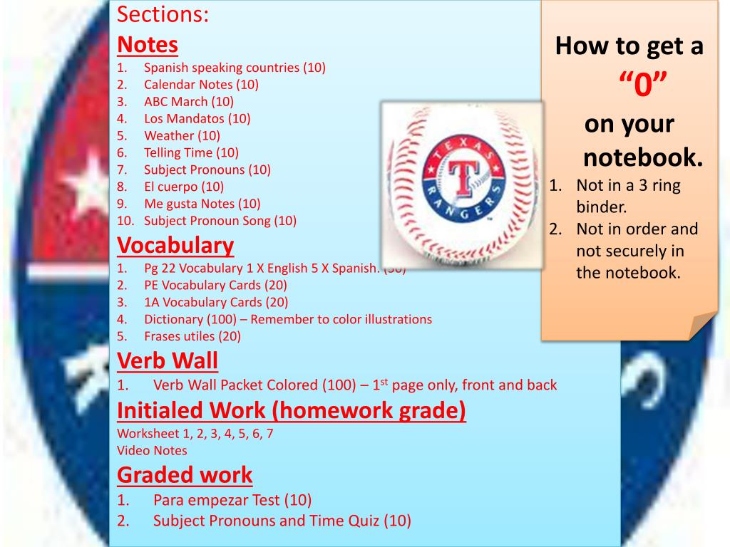 How to get a “0” on your notebook. Not in a 3 ring binder. Not in order and not securely in the notebook. Sections: Notes Spanish speaking countries (10) Calendar Notes (10) ABC March (10) Los Mandatos (10) Weather (10) Telling Time (10) Subject Pronouns (10) El cuerpo (10) Me gusta Notes (10) Subject Pronoun Song (10) Vocabulary Pg 22 Vocabulary 1 X English 5 X Spanish. (50) PE Vocabulary Cards (20) 1A Vocabulary Cards (20) Dictionary (100) – Remember to color illustrations Frasesutiles (20) Verb Wall Verb Wall Packet Colored (100) – 1st page only, front and back Initialed Work (homework grade) Worksheet 1, 2, 3, 4, 5, 6, 7 Video Notes Graded work Para empezar Test (10) Subject Pronouns and Time Quiz (10)