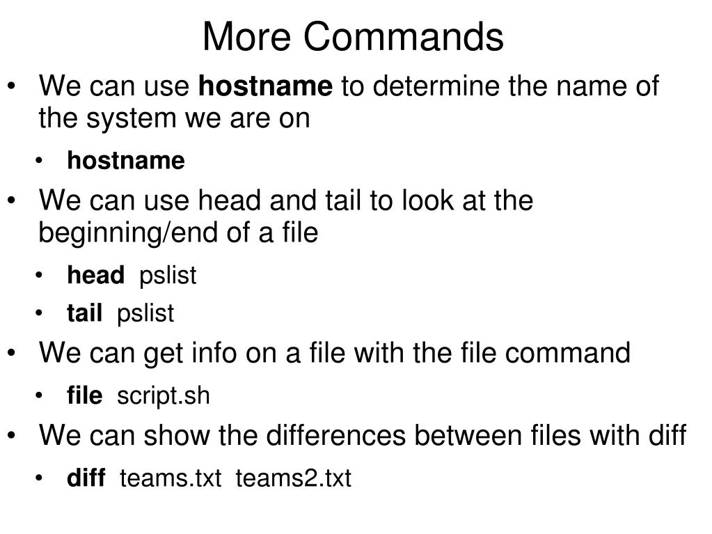 More Commands • We can use hostname to determine the name of the system we are on • hostname • We can use head and tail to look at the beginning/end of a file • head pslist • tail pslist • We can get info on a file with the file command • file script.sh • We can show the differences between files with diff • diff teams.txt teams2.txt