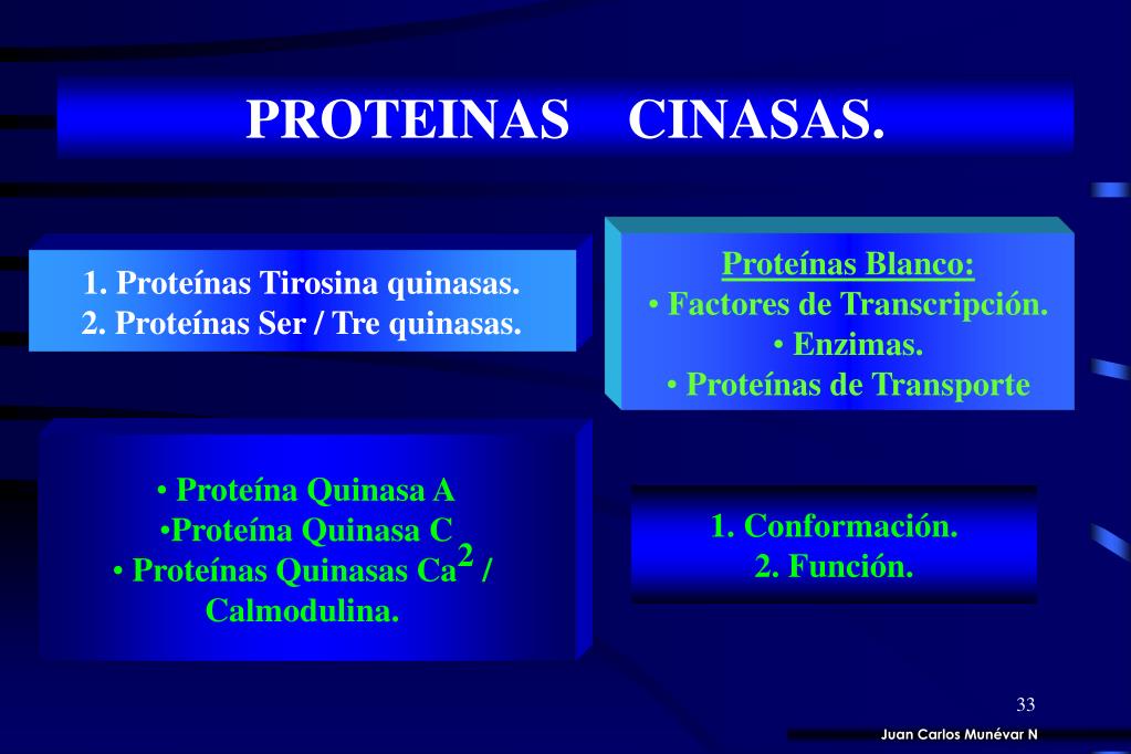 PROTEINAS CINASAS. • Proteínas Blanco: • Factores de Transcripción. • Enzimas. • Proteínas de Transporte 1. Proteínas Tirosina quinasas. 2. Proteínas Ser / Tre quinasas. • Proteína Quinasa A • Proteína Quinasa C • Proteínas Quinasas Ca2 / • Calmodulina. 1. Conformación. 2. Función. Juan Carlos Munévar N