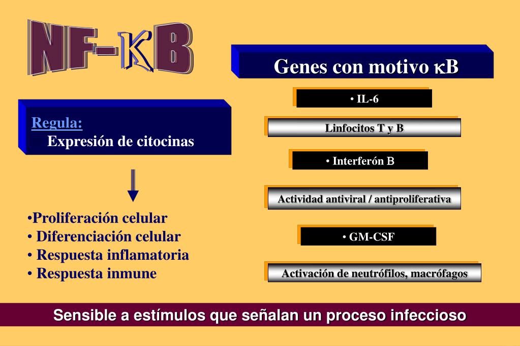 NF- B k Genes con motivo kB • IL-6 • Regula: • Expresión de citocinas Linfocitos T y B • Interferón B Actividad antiviral / antiproliferativa • Proliferación celular • Diferenciación celular • Respuesta inflamatoria • Respuesta inmune • GM-CSF Activación de neutrófilos, macrófagos Sensible a estímulos que señalan un proceso infeccioso
