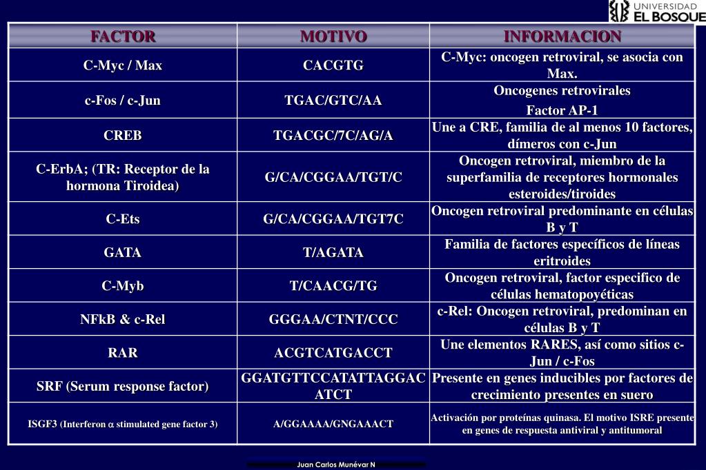 GENES CON MOTIVO C.R.E. 1. Tiroxina hidroxilasa 2. Somatostatina 1. Enzimas metabolismo intermedio 2. Péptidos Bioactivos. 3. Fibronectina plasmática. 4. Proto oncogen c-fos Juan Carlos Munévar N