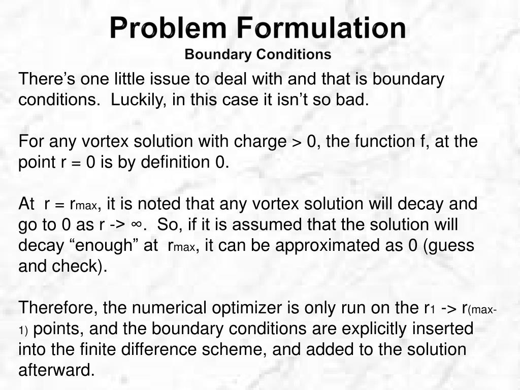 Problem FormulationBoundary Conditions There’s one little issue to deal with and that is boundary conditions. Luckily, in this case it isn’t so bad. For any vortex solution with charge > 0, the function f, at the point r = 0 is by definition 0. At r = rmax, it is noted that any vortex solution will decay and go to 0 as r -> ∞. So, if it is assumed that the solution will decay “enough” at rmax, it can be approximated as 0 (guess and check). Therefore, the numerical optimizer is only run on the r1 -> r(max-1) points, and the boundary conditions are explicitly inserted into the finite difference scheme, and added to the solution afterward.