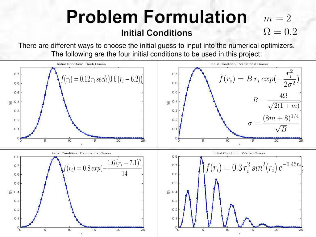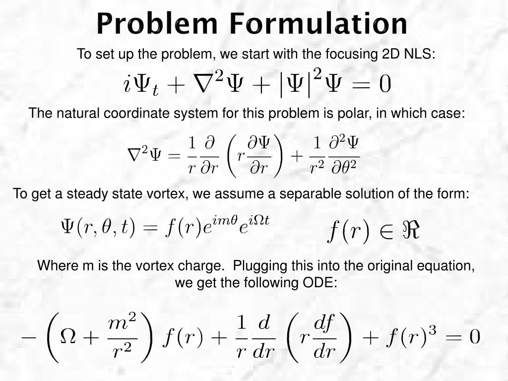 Problem Formulation To get a steady state vortex, we assume a separable solution of the form: To set up the problem, we start with the focusing 2D NLS: The natural coordinate system for this problem is polar, in which case: Where m is the vortex charge. Plugging this into the original equation, we get the following ODE: