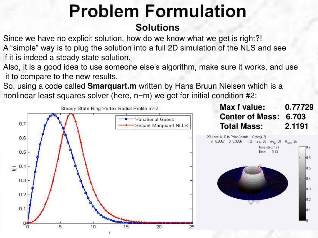 Problem FormulationSolutions Since we have no explicit solution, how do we know what we get is right?! A “simple” way is to plug the solution into a full 2D simulation of the NLS and see if it is indeed a steady state solution. Also, it is a good idea to use someone else’s algorithm, make sure it works, and use it to compare to the new results. So, using a code called Smarquart.m written by Hans Bruun Nielsen which is a nonlinear least squares solver (here, n=m) we get for initial condition #2: Max f value: 0.77729 Center of Mass: 6.703 Total Mass: 2.1191