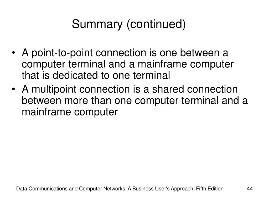 Summary (continued) • A point-to-point connection is one between a computer terminal and a mainframe computer that is dedicated to one terminal • A multipoint connection is a shared connection between more than one computer terminal and a mainframe computer Data Communications and Computer Networks: A Business User's Approach, Fifth Edition