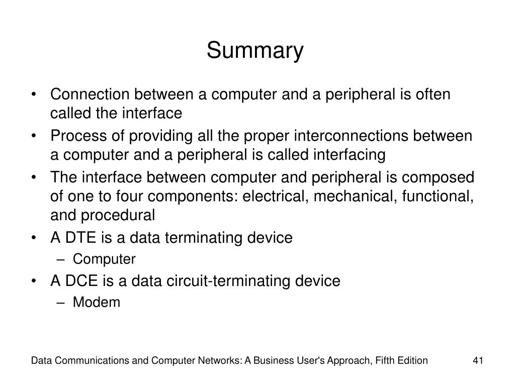 Summary • Connection between a computer and a peripheral is often called the interface • Process of providing all the proper interconnections between a computer and a peripheral is called interfacing • The interface between computer and peripheral is composed of one to four components: electrical, mechanical, functional, and procedural • A DTE is a data terminating device • Computer • A DCE is a data circuit-terminating device • Modem Data Communications and Computer Networks: A Business User's Approach, Fifth Edition