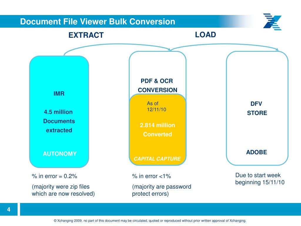 Document File Viewer Bulk Conversion LOAD EXTRACT PDF & OCR CONVERSION DFV STORE IMR 4.5 million Documents extracted 2.814 million Converted As of 12/11/10 ADOBE AUTONOMY CAPITAL CAPTURE Due to start week beginning 15/11/10 % in error = 0.2% (majority were zip files which are now resolved) % in error <1% (majority are password protect errors)