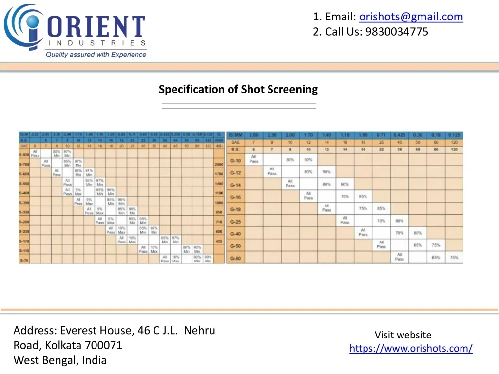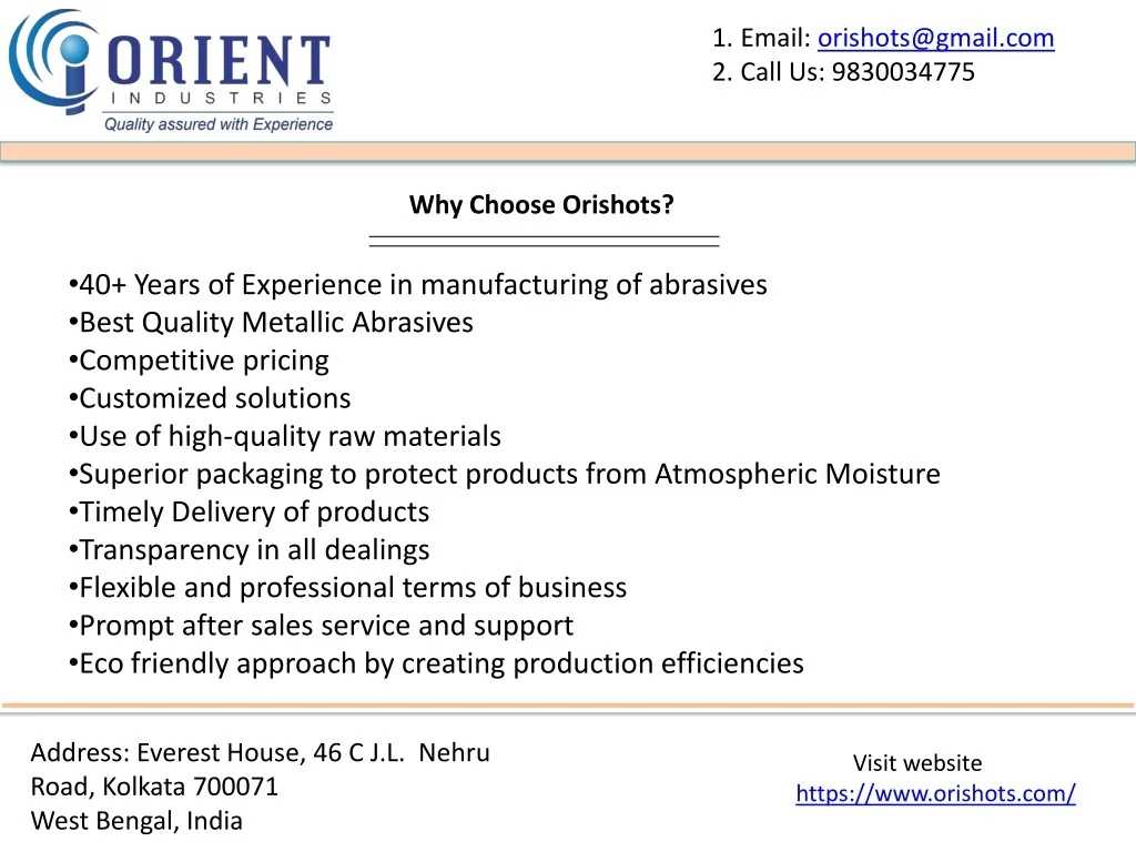 Email: orishots@gmail.com Call Us: 9830034775 Why Choose Orishots? • 40+ Years of Experience in manufacturing of abrasives • Best Quality Metallic Abrasives • Competitive pricing • Customized solutions • Use of high-quality raw materials • Superior packaging to protect products from Atmospheric Moisture • Timely Delivery of products • Transparency in all dealings • Flexible and professional terms of business • Prompt after sales service and support • Eco friendly approach by creating production efficiencies Address: Everest House, 46 C J.L. Nehru Road, Kolkata 700071 West Bengal, India Visit website https://www.orishots.com/