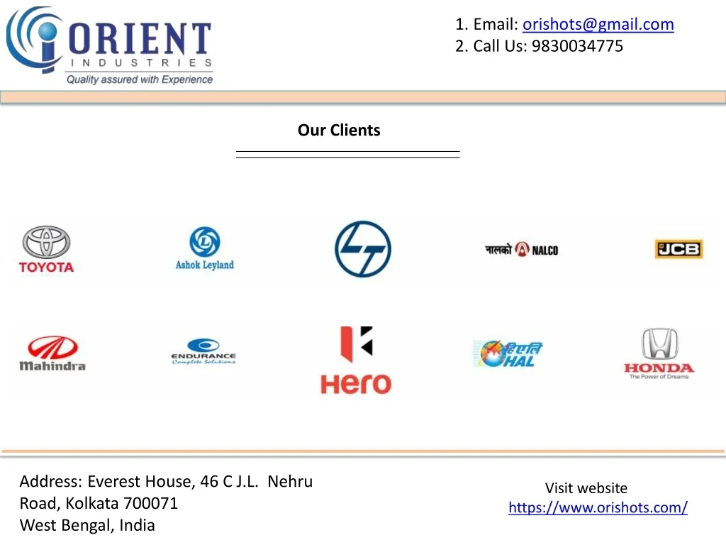 1. Email: orishots@gmail.com 2. Call Us: 9830034775 Our Clients Address: Everest House, 46 C J.L. Nehru Road, Kolkata 700071 West Bengal, India Visit website https://www.orishots.com/