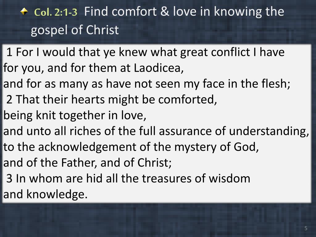 1 For I would that ye knew what great conflict I have for you, and for them at Laodicea, and for as many as have not seen my face in the flesh; 2 That their hearts might be comforted, being knit together in love, and unto all riches of the full assurance of understanding, to the acknowledgement of the mystery of God, and of the Father, and of Christ; 3 In whom are hid all the treasures of wisdom and knowledge. • Col. 2:1-3 Find comfort & love in knowing the gospel of Christ