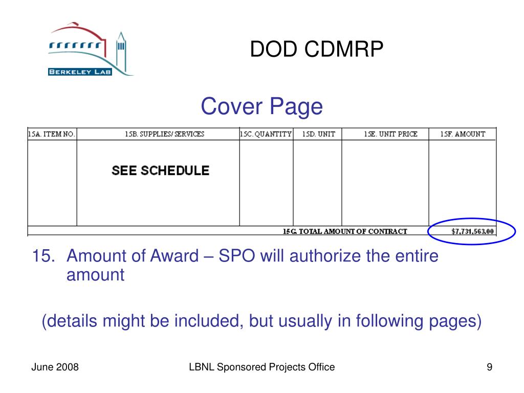 DOD CDMRP Cover Page • Amount of Award – SPO will authorize the entire amount (details might be included, but usually in following pages) LBNL Sponsored Projects Office