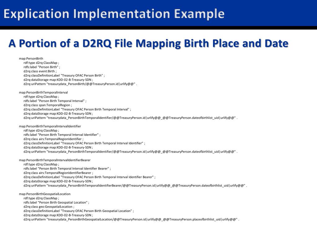 Explication Implementation Example A Portion of a D2RQ File Mapping Birth Place and Date map:PersonBirth rdf:type d2rq:ClassMap ; rdfs:label "Person Birth" ; d2rq:class event:Birth ; d2rq:classDefinitionLabel "Treasury OFAC Person Birth" ; d2rq:dataStorage map:KDD-02-B-Treasury-SDN ; d2rq:uriPattern "treasurydata_PersonBirth/@@TreasuryPerson.id|urlify@@" . map:PersonBirthTemporalInterval rdf:type d2rq:ClassMap ; rdfs:label "Person Birth Temporal Interval" ; d2rq:class span:TemporalRegion ; d2rq:classDefinitionLabel "Treasury OFAC Person Birth Temporal Interval" ; d2rq:dataStorage map:KDD-02-B-Treasury-SDN ; d2rq:uriPattern "treasurydata_PersonBirthTemporalIdentifier/@@TreasuryPerson.id|urlify@@_@@TreasuryPerson.dateofbirthlist_uid|urlify@@" . map:PersonBirthTemporalIntervalIdentifier rdf:type d2rq:ClassMap ; rdfs:label "Person Birth Temporal Interval Identifier" ; d2rq:class airs:TemporalRegionIdentifier ; d2rq:classDefinitionLabel "Treasury OFAC Person Birth Temporal Interval Identifier" ; d2rq:dataStorage map:KDD-02-B-Treasury-SDN ; d2rq:uriPattern "treasurydata_PersonBirthTemporalIdentifier/@@TreasuryPerson.id|urlify@@_@@TreasuryPerson.dateofbirthlist_uid|urlify@@" . map:PersonBirthTemporalIntervalIdentifierBearer rdf:type d2rq:ClassMap ; rdfs:label "Person Birth Temporal Interval Identifier Bearer" ; d2rq:class airs:TemporalRegionIdentifierBearer ; d2rq:classDefinitionLabel "Treasury OFAC Person Birth Temporal Interval Identifier Bearer" ; d2rq:dataStorage map:KDD-02-B-Treasury-SDN ; d2rq:uriPattern "treasurydata_PersonBirthTemporalIdentifierBearer/@@TreasuryPerson.id|urlify@@_@@TreasuryPerson.dateofbirthlist_uid|urlify@@" . map:PersonBirthGeospatialLocation rdf:type d2rq:ClassMap ; rdfs:label "Person Birth Geospatial Location" ; d2rq:class geo:GeospatialLocation ; d2rq:classDefinitionLabel "Treasury OFAC Person Birth Geospatial Location" ; d2rq:dataStorage map:KDD-02-B-Treasury-SDN ; d2rq:uriPattern "treasurydata_PersonBirthGeospatialLocation/@@TreasuryPerson.id|urlify@@_@@TreasuryPerson.placeofbirthlist_uid|urlify@@" .