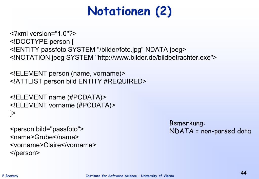 Notationen (2) <?xml version="1.0"?><!DOCTYPE person [<!ENTITY passfoto SYSTEM "/bilder/foto.jpg" NDATA jpeg><!NOTATION jpeg SYSTEM "http://www.bilder.de/bildbetrachter.exe"><!ELEMENT person (name, vorname)><!ATTLIST person bild ENTITY #REQUIRED><!ELEMENT name (#PCDATA)><!ELEMENT vorname (#PCDATA)>]><person bild="passfoto"><name>Grube</name><vorname>Claire</vorname></person> Bemerkung: NDATA = non-parsed data