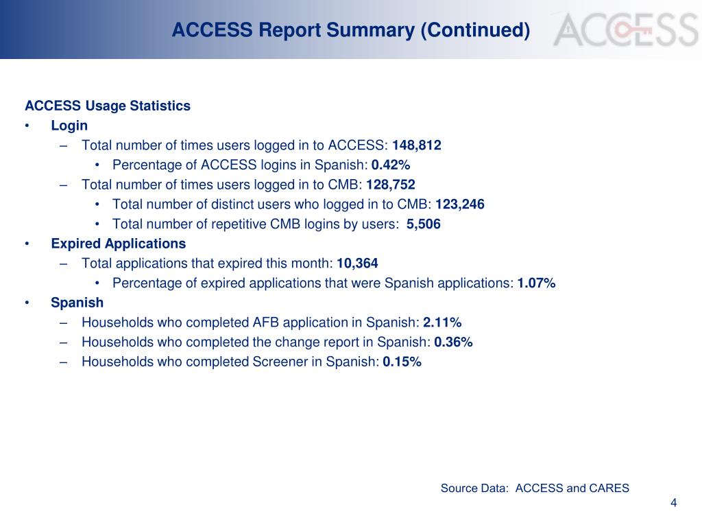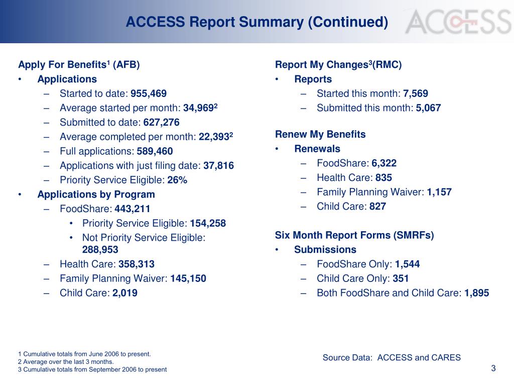 ACCESS Report Summary (Continued) • Report My Changes3(RMC) • Reports • Started this month: 7,569 • Submitted this month: 5,067 • Renew My Benefits • Renewals • FoodShare: 6,322 • Health Care: 835 • Family Planning Waiver: 1,157 • Child Care: 827 • Six Month Report Forms (SMRFs) • Submissions • FoodShare Only: 1,544 • Child Care Only: 351 • Both FoodShare and Child Care: 1,895 Apply For Benefits1 (AFB) • Applications • Started to date: 955,469 • Average started per month: 34,9692 • Submitted to date: 627,276 • Average completed per month: 22,3932 • Full applications: 589,460 • Applications with just filing date: 37,816 • Priority Service Eligible: 26% • Applications by Program • FoodShare: 443,211 • Priority Service Eligible: 154,258 • Not Priority Service Eligible: 288,953 • Health Care: 358,313 • Family Planning Waiver: 145,150 • Child Care: 2,019 1 Cumulative totals from June 2006 to present. 2 Average over the last 3 months. 3 Cumulative totals from September 2006 to present Source Data: ACCESS and CARES