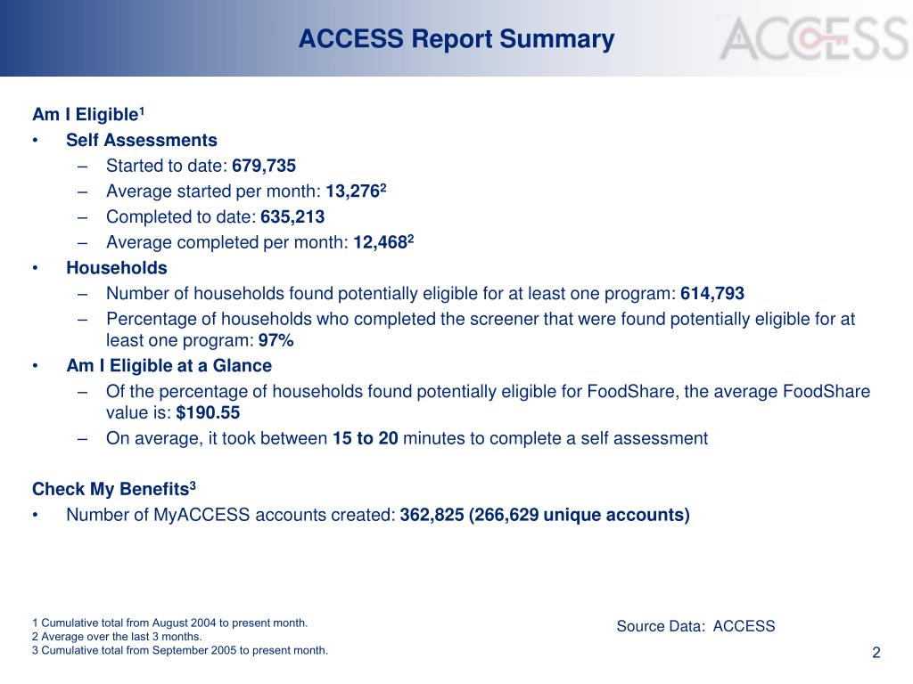 A CCESS TO E LIGIBILITY S UPPORT S ERVICES FOR H EALTH AND N UTRITION Usage and Eligibility Results Report As of 11/30/2010. ACCESS Report Summary. Am I Eligible 1 Self Assessments Started to date: 679,735 Average started per month: 13,276 2 Completed to date: 635,213