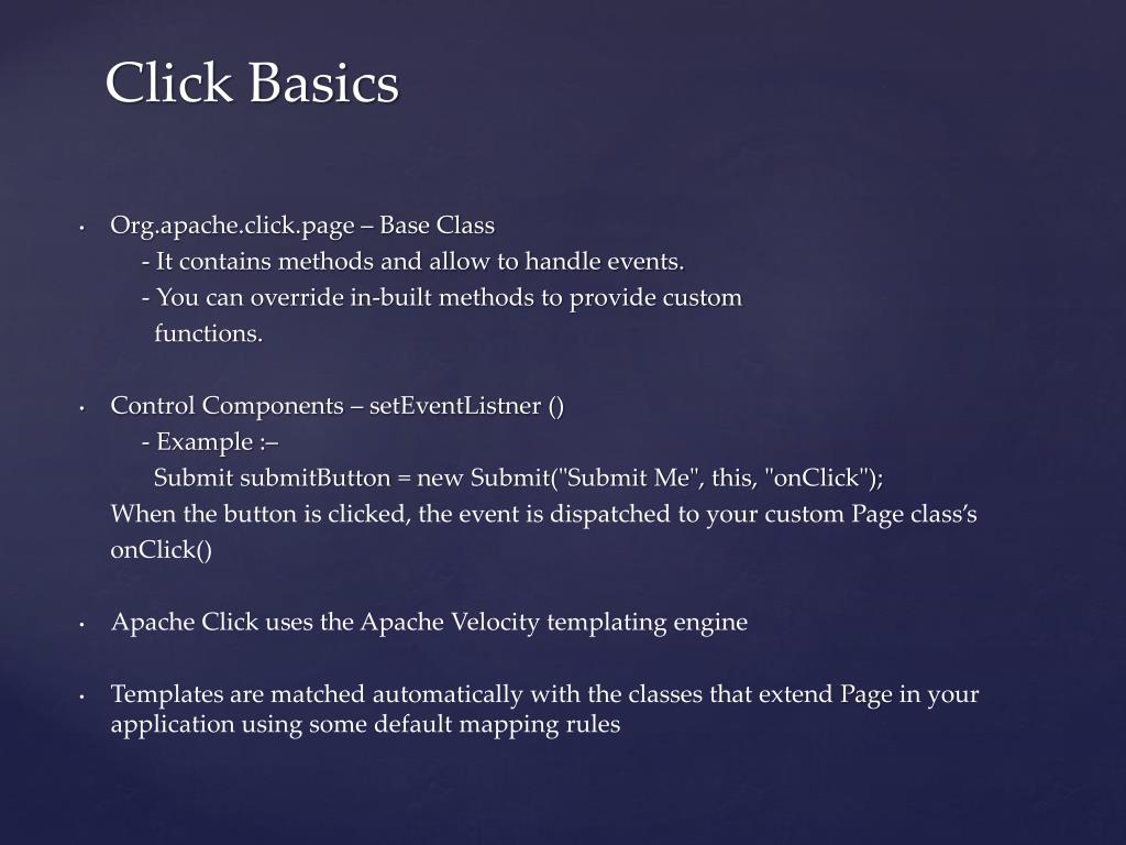 Org.apache.click.page – Base Class - It contains methods and allow to handle events. - You can override in-built methods to provide custom functions. • Control Components – setEventListner () - Example :– Submit submitButton = new Submit("Submit Me", this, "onClick"); When the button is clicked, the event is dispatched to your custom Page class’s onClick() • Apache Click uses the Apache Velocity templatingengine • Templates are matched automatically with the classes that extend Page in your application using some default mapping rules Click Basics
