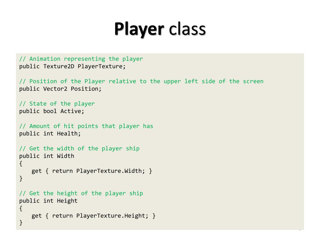Player class // Animation representing the playerpublic Texture2D PlayerTexture;// Position of the Player relative to the upper left side of the screenpublic Vector2 Position;// State of the playerpublic bool Active;// Amount of hit points that player haspublic int Health;// Get the width of the player shippublic int Width{ get { return PlayerTexture.Width; }}// Get the height of the player shippublic int Height{ get { return PlayerTexture.Height; }}