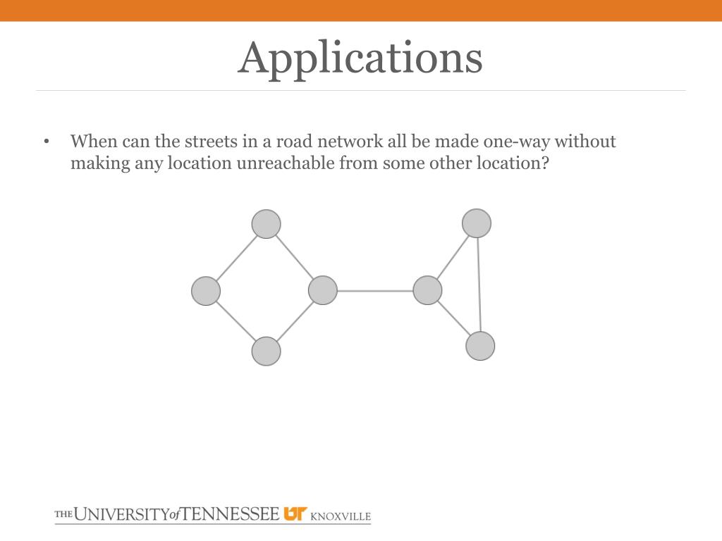 Applications • When can the streets in a road network all be made one-way without making any location unreachable from some other location?