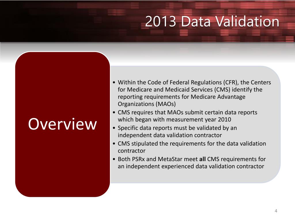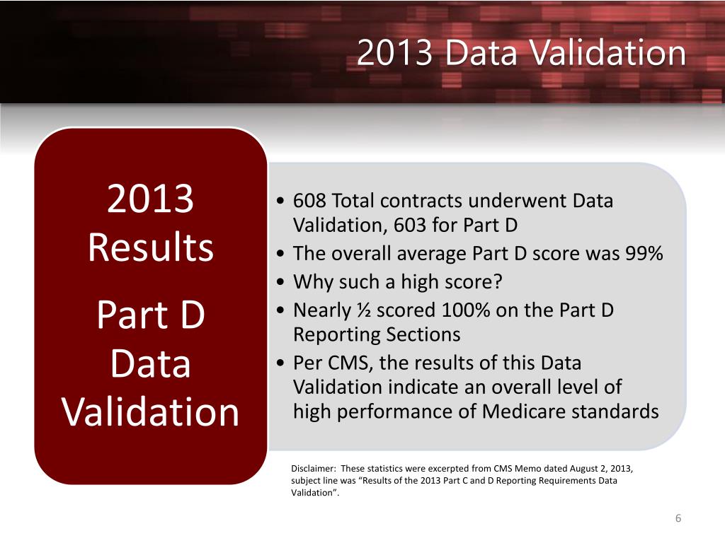 2013 Data Validation Disclaimer: These statistics were excerpted from CMS Memo dated August 2, 2013, subject line was “Results of the 2013 Part C and D Reporting Requirements Data Validation”.