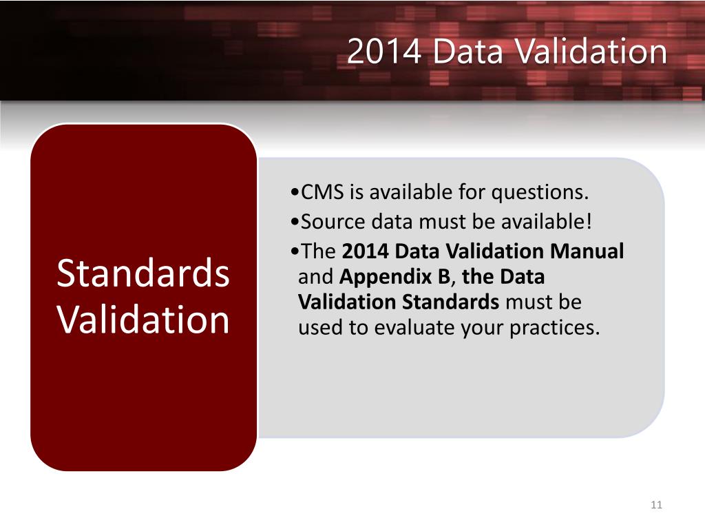 2014 Data Validation • StandardsValidation • CMS is available for questions. • Source data must be available! • The 2014 Data Validation Manual and Appendix B, the Data Validation Standards must be used to evaluate your practices.
