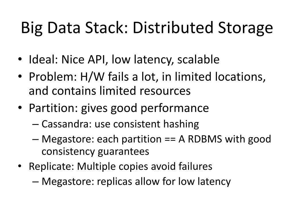 Big Data Stack: Distributed Storage • Ideal: Nice API, low latency, scalable • Problem: H/W fails a lot, in limited locations, and contains limited resources • Partition: gives good performance • Cassandra: use consistent hashing • Megastore: each partition == A RDBMS with good consistency guarantees • Replicate: Multiple copies avoid failures • Megastore: replicas allow for low latency