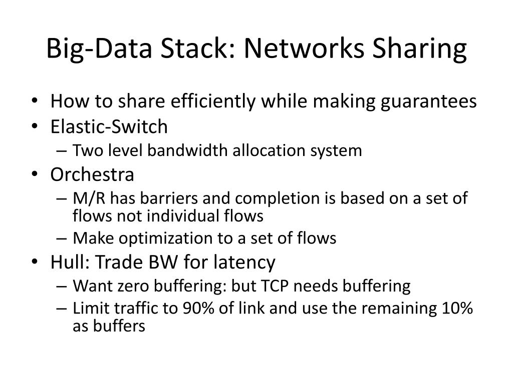 Big-Data Stack: Networks Sharing • How to share efficiently while making guarantees • Elastic-Switch • Two level bandwidth allocation system • Orchestra • M/R has barriers and completion is based on a set of flows not individual flows • Make optimization to a set of flows • Hull: Trade BW for latency • Want zero buffering: but TCP needs buffering • Limit traffic to 90% of link and use the remaining 10% as buffers