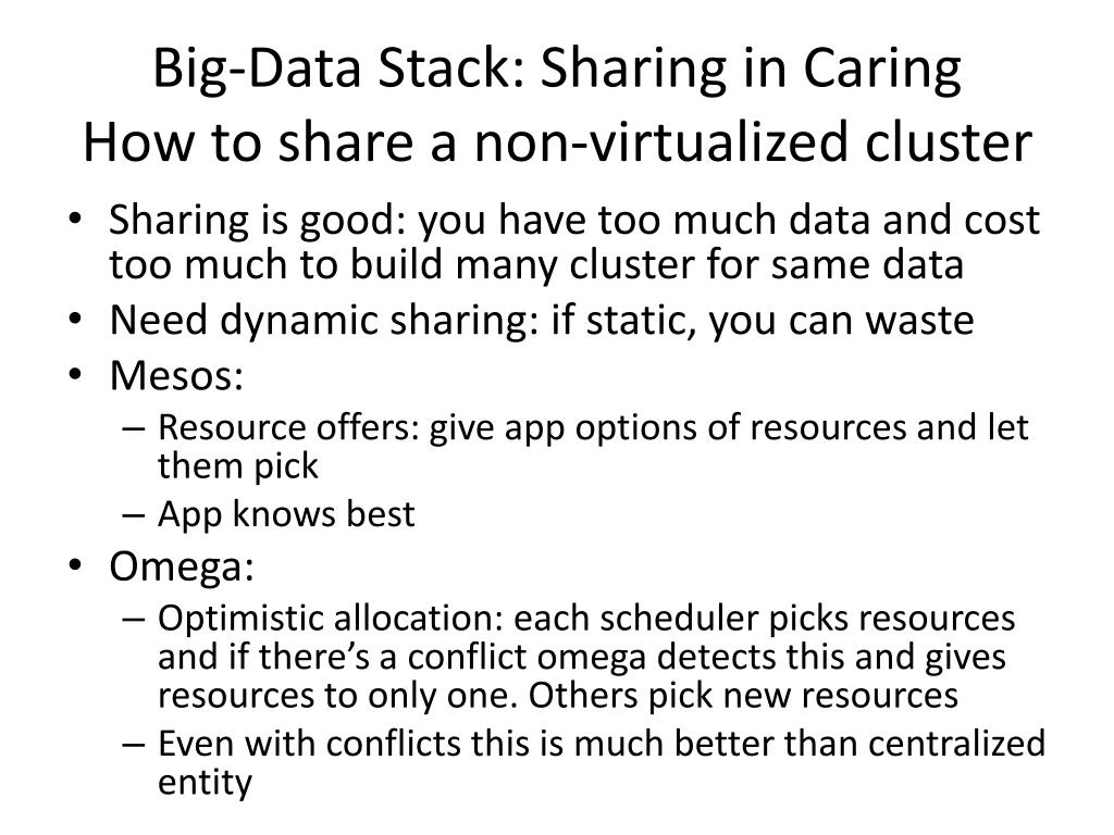 Big-Data Stack: Sharing in CaringHow to share a non-virtualized cluster • Sharing is good: you have too much data and cost too much to build many cluster for same data • Need dynamic sharing: if static, you can waste • Mesos: • Resource offers: give app options of resources and let them pick • App knows best • Omega: • Optimistic allocation: each scheduler picks resources and if there’s a conflict omega detects this and gives resources to only one. Others pick new resources • Even with conflicts this is much better than centralized entity