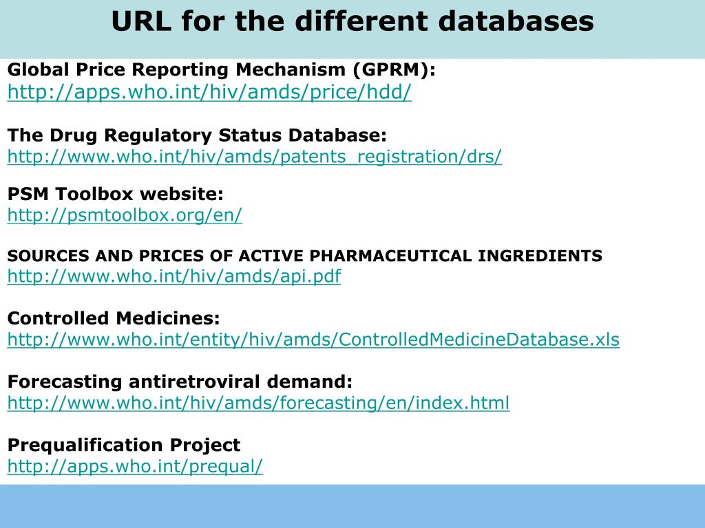 URL for the differentdatabases • Global Price Reporting Mechanism (GPRM): • http://apps.who.int/hiv/amds/price/hdd/ • The Drug Regulatory Status Database: • http://www.who.int/hiv/amds/patents_registration/drs/ • PSM Toolbox website: • http://psmtoolbox.org/en/ • SOURCES AND PRICES OF ACTIVE PHARMACEUTICAL INGREDIENTS • http://www.who.int/hiv/amds/api.pdf • Controlled Medicines: • http://www.who.int/entity/hiv/amds/ControlledMedicineDatabase.xls • Forecasting antiretroviral demand: • http://www.who.int/hiv/amds/forecasting/en/index.html • Prequalification Project • http://apps.who.int/prequal/
