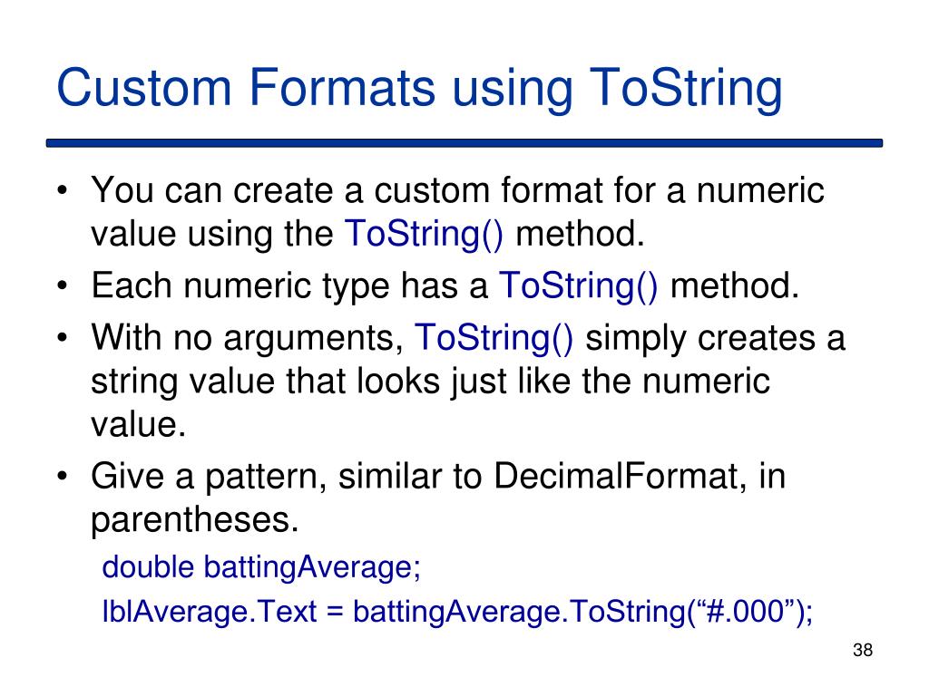 Custom Formats using ToString • You can create a custom format for a numeric value using the ToString() method. • Each numeric type has a ToString() method. • With no arguments, ToString() simply creates a string value that looks just like the numeric value. • Give a pattern, similar to DecimalFormat, in parentheses. double battingAverage; lblAverage.Text = battingAverage.ToString(“#.000”);