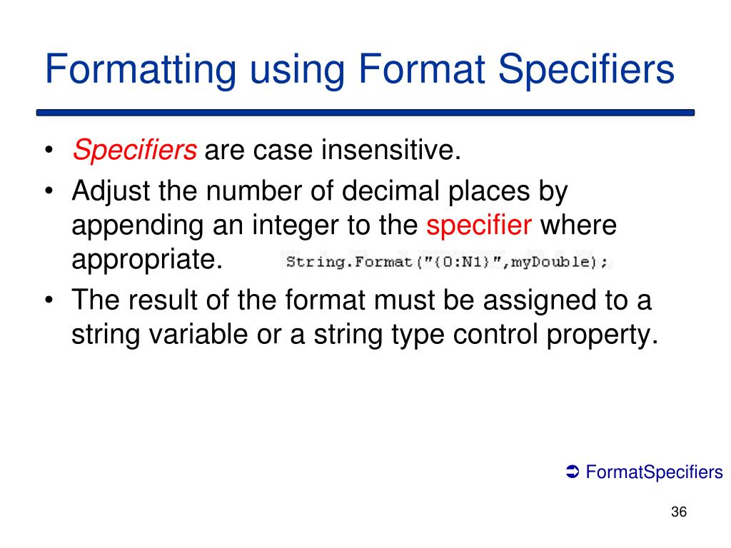 Formatting using Format Specifiers • Specifiers are case insensitive. • Adjust the number of decimal places by appending an integer to the specifier where appropriate. • The result of the format must be assigned to a string variable or a string type control property. FormatSpecifiers