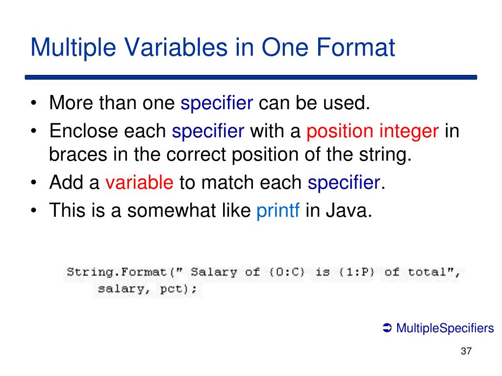 Multiple Variables in One Format • More than one specifier can be used. • Enclose each specifier with a position integer in braces in the correct position of the string. • Add a variable to match each specifier. • This is a somewhat like printf in Java. MultipleSpecifiers