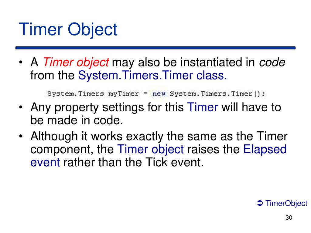 Timer Object • A Timer object may also be instantiated in code from the System.Timers.Timer class. • Any property settings for this Timer will have to be made in code. • Although it works exactly the same as the Timer component, the Timer object raises the Elapsed event rather than the Tick event. TimerObject