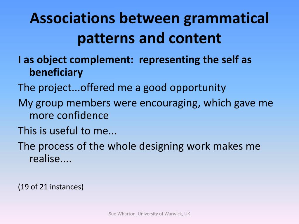 Associations between grammatical patterns and content I as object complement: representing the self as beneficiary The project...offered me a good opportunity My group members were encouraging, which gave me more confidence This is useful to me... The process of the whole designing work makes me realise.... (19 of 21 instances) Sue Wharton, University of Warwick, UK