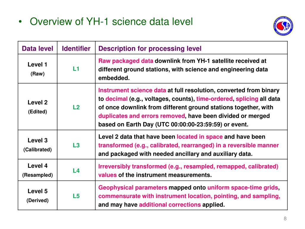 1. Objectives of YH-1 Science Data System • Process the down-linked raw data to PDS3-compliant high quality higher level data products • Collect suitable organized and well-documented YH-1 science data products into PDS3-compliant YH-1 science data archives that would be peer-reviewed, make them available and useful to users • Provide online YH-1 science data access to the international planetary science communities • Ensure the long-term preservation of the data products and maintain their usability 3
