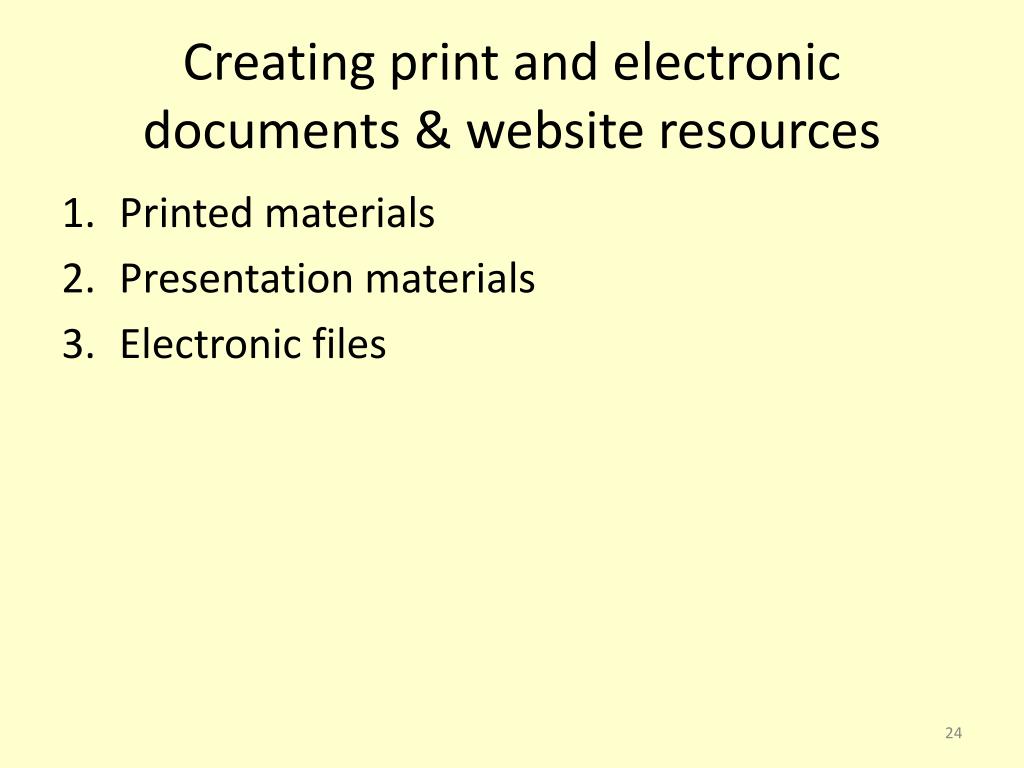 Creating print and electronic documents & website resources • Printed materials • Presentation materials • Electronic files