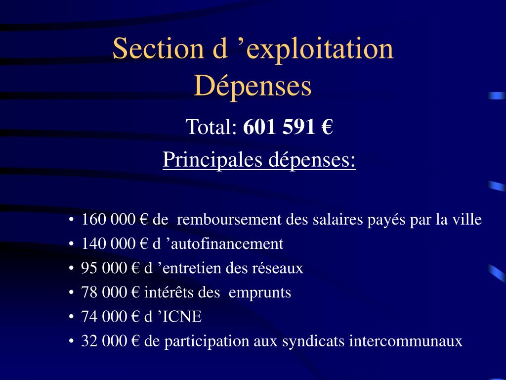 Section d ’exploitationDépenses Total: 601 591 € Principales dépenses: • 160 000 € de remboursement des salaires payés par la ville • 140 000 € d ’autofinancement • 95 000 € d ’entretien des réseaux • 78 000 € intérêts des emprunts • 74 000 € d ’ICNE • 32 000 € de participation aux syndicats intercommunaux