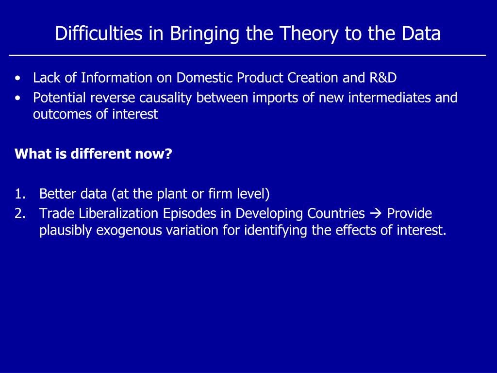 Difficulties in Bringing the Theory to the Data • Lack of Information on Domestic Product Creation and R&D • Potential reverse causality between imports of new intermediates and outcomes of interest What is different now? • Better data (at the plant or firm level) • Trade Liberalization Episodes in Developing Countries Provide plausibly exogenous variation for identifying the effects of interest.