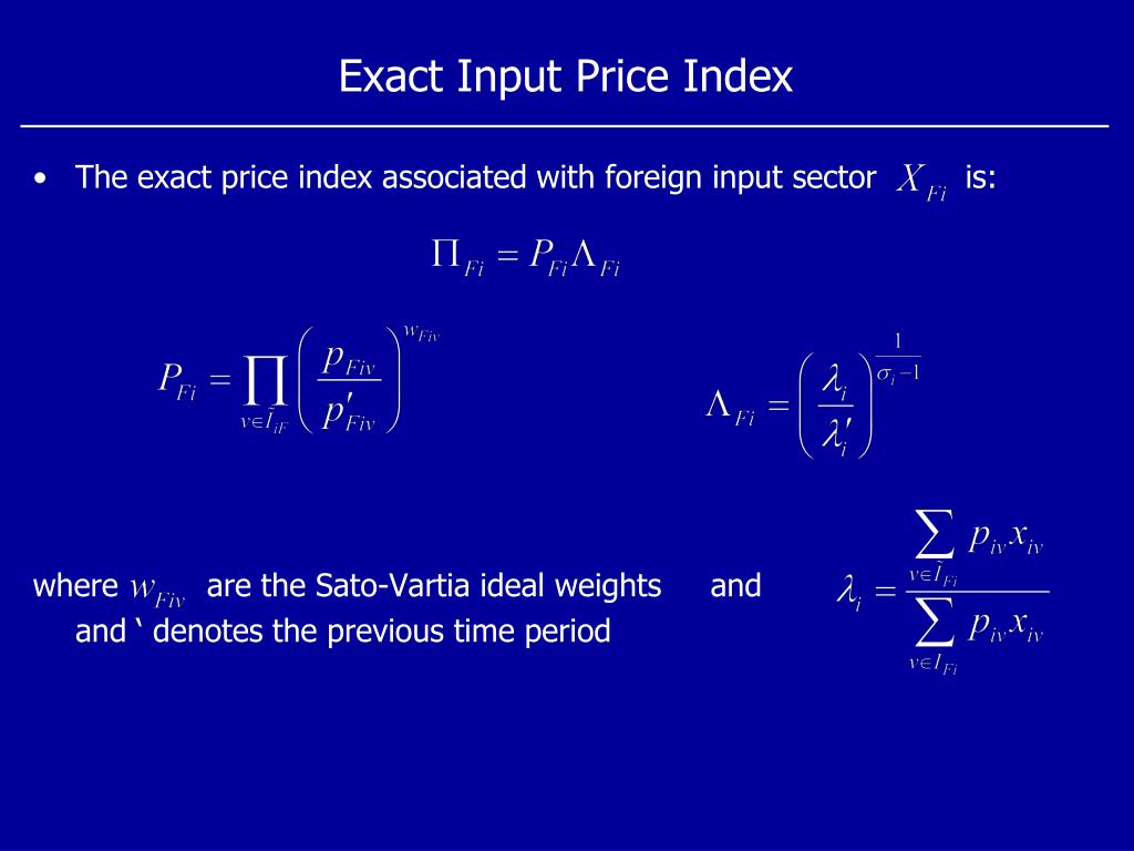 Exact Input Price Index • The exact price index associated with foreign input sector is: where are the Sato-Vartia ideal weights and and ‘ denotes the previous time period