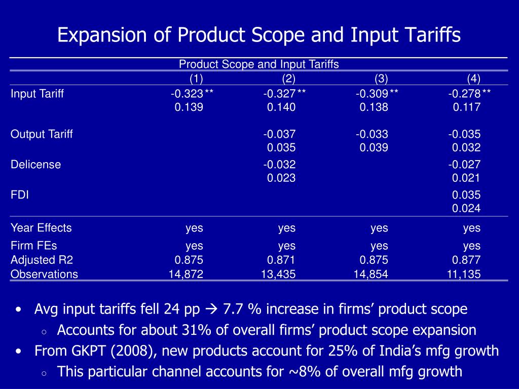 Expansion of Product Scope and Input Tariffs • Avg input tariffs fell 24 pp 7.7 % increase in firms’ product scope • Accounts for about 31% of overall firms’ product scope expansion • From GKPT (2008), new products account for 25% of India’s mfg growth • This particular channel accounts for ~8% of overall mfg growth