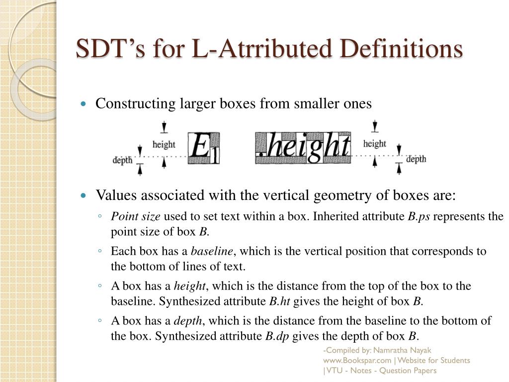 SDT’s for L-Atrributed Definitions • SDD for computing point sizes, heights and depths -Compiled by: Namratha Nayak www.Bookspar.com | Website for Students | VTU - Notes - Question Papers