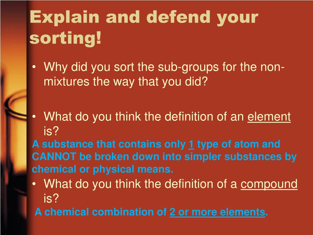 Explain and defend your sorting! • Why did you sort the sub-groups for the non-mixtures the way that you did? • What do you think the definition of an element is? • What do you think the definition of a compound is? A substance that contains only 1 type of atom and CANNOT be broken down into simpler substances by chemical or physical means. A chemical combination of 2 or more elements.
