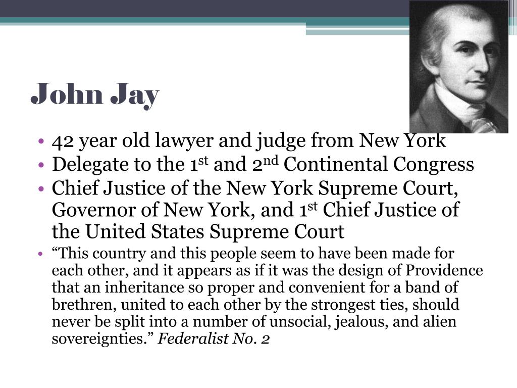 John Jay • 42 year old lawyer and judge from New York • Delegate to the 1st and 2nd Continental Congress • Chief Justice of the New York Supreme Court, Governor of New York, and 1st Chief Justice of the United States Supreme Court • “This country and this people seem to have been made for each other, and it appears as if it was the design of Providence that an inheritance so proper and convenient for a band of brethren, united to each other by the strongest ties, should never be split into a number of unsocial, jealous, and alien sovereignties.” Federalist No. 2