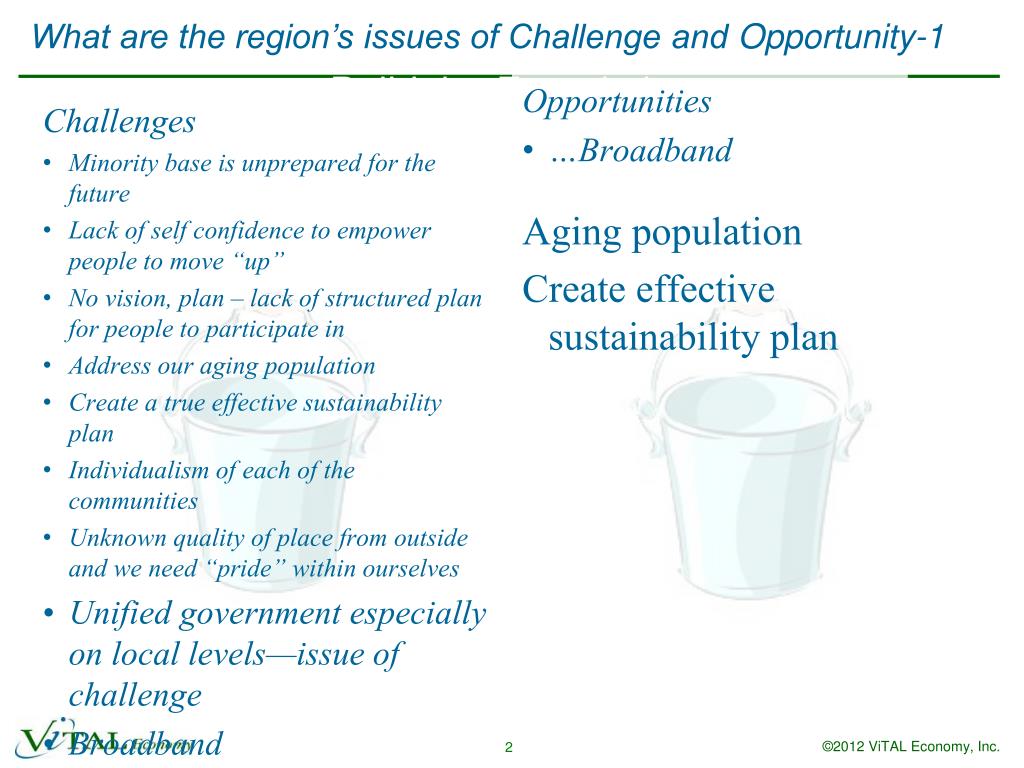 Workshop Input – Build the Foundation What are the region’s issues of Challenge and Opportunity-1 • Opportunities • …Broadband • Aging population • Create effective sustainability plan • Challenges • Minority base is unprepared for the future • Lack of self confidence to empower people to move “up” • No vision, plan – lack of structured plan for people to participate in • Address our aging population • Create a true effective sustainability plan • Individualism of each of the communities • Unknown quality of place from outside and we need “pride” within ourselves • Unified government especially on local levels—issue of challenge • Broadband