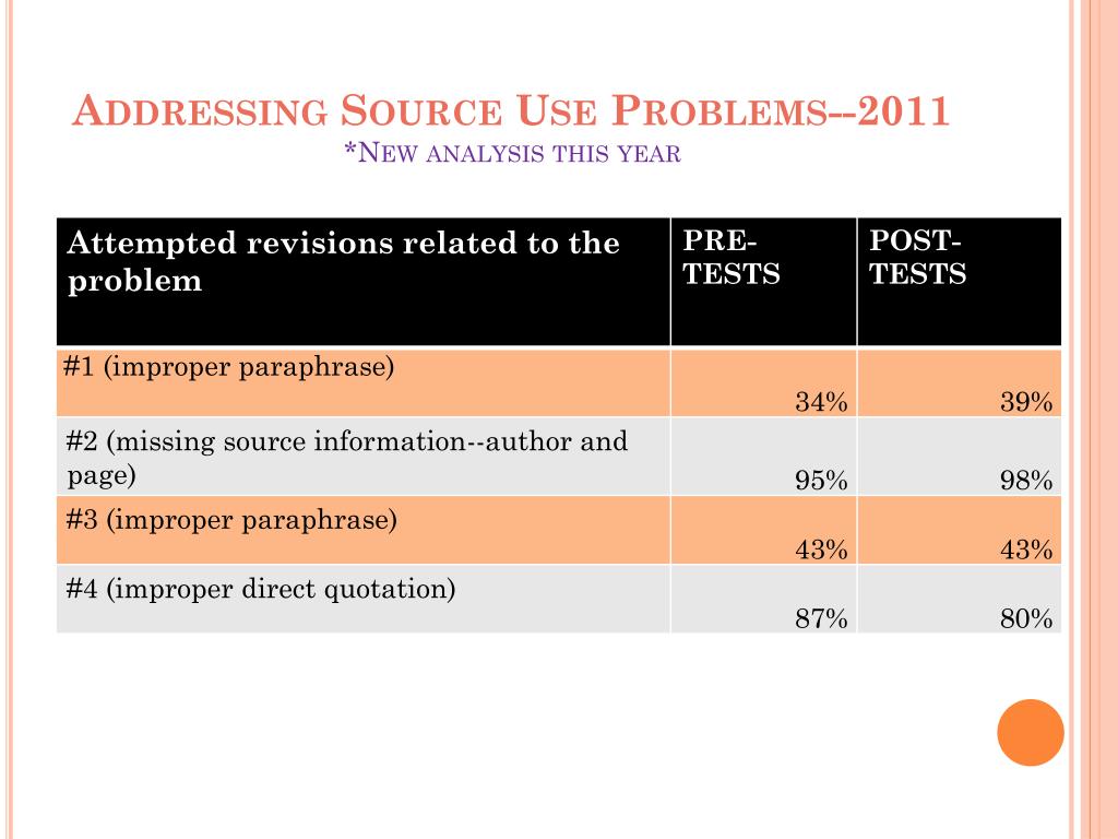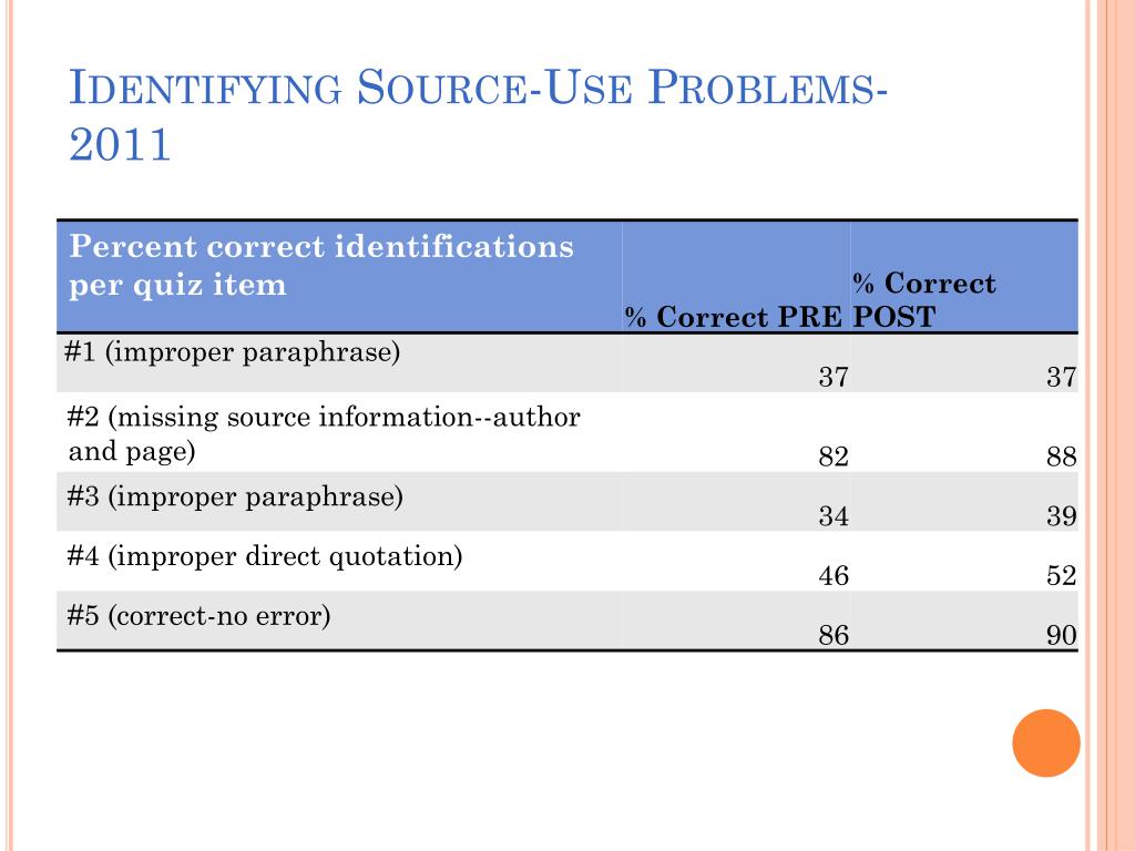 Criterion for success (from 2010 assessment report) • At the end of English 1200, students will effectively identify improper source use 70% of the time and partially or wholly correct source use problems at least 70% of the time.
