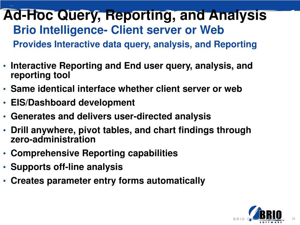 Ad-Hoc Query, Reporting, and Analysis Brio Intelligence- Client server or Web Provides Interactive data query, analysis, and Reporting • Interactive Reporting and End user query, analysis, and reporting tool • Same identical interface whether client server or web • EIS/Dashboard development • Generates and delivers user-directed analysis • Drill anywhere, pivot tables, and chart findings through zero-administration • Comprehensive Reporting capabilities • Supports off-line analysis • Creates parameter entry forms automatically B R I O C O N F I D E N T I A L