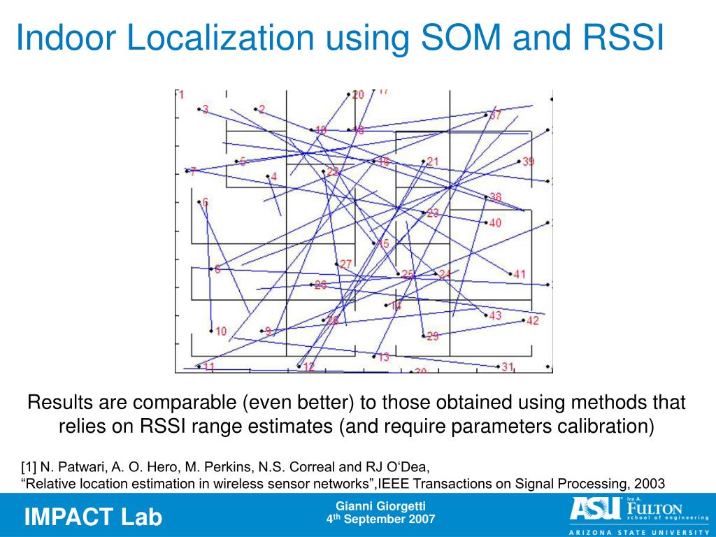 Indoor Localization using SOM and RSSI Average Error ~= 1.3 m Results are comparable (even better) to those obtained using methods that relies on RSSI range estimates (and require parameters calibration) [1] N. Patwari, A. O. Hero, M. Perkins, N.S. Correal and RJ O‘Dea, “Relative location estimation in wireless sensor networks”,IEEE Transactions on Signal Processing, 2003