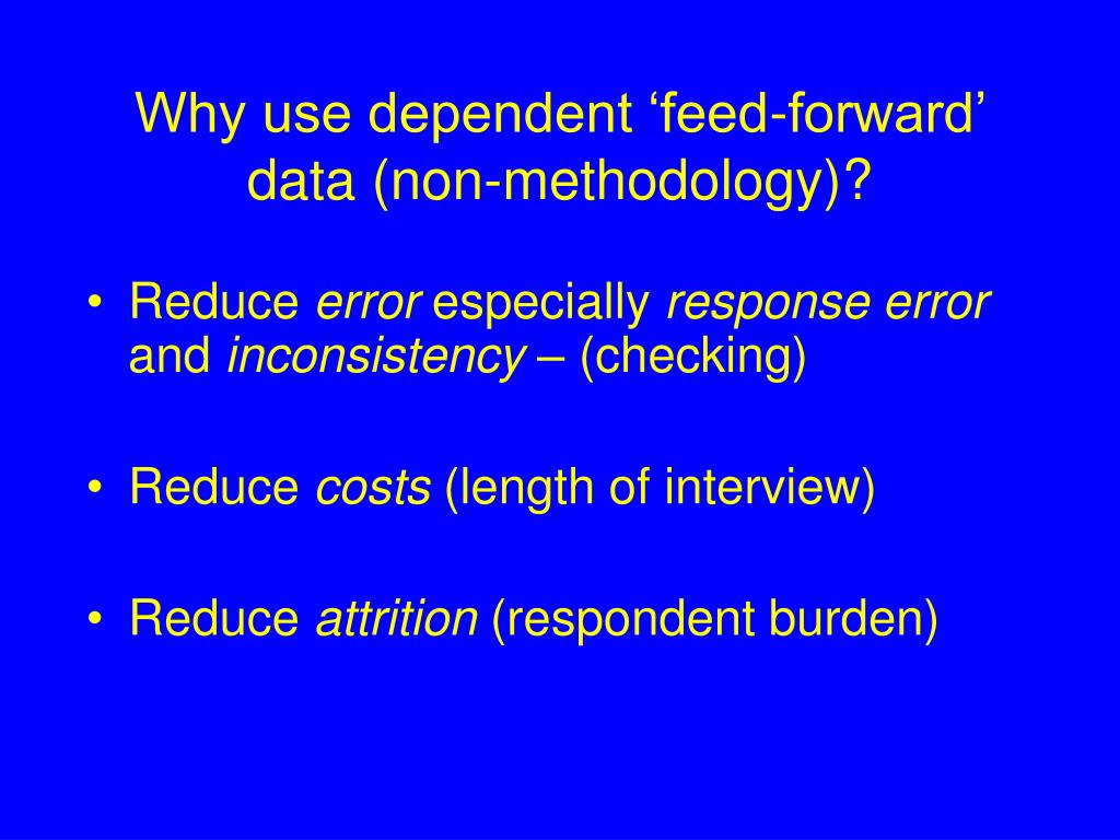 Why use dependent ‘feed-forward’ data (non-methodology)? • Reduce error especially response error and inconsistency – (checking) • Reduce costs (length of interview) • Reduce attrition (respondent burden)